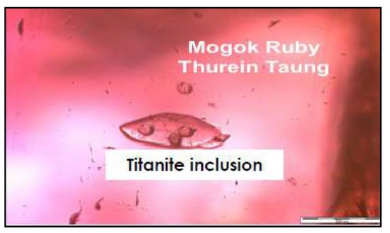 The U-Pb age of the Thurein Taung composite titanite inclusion at 32.4 ± 1 Ma, matches the age of small leucocratic granite bodies that intrude the area [25]. The near-euhedral crystal form suggests a likely syngenetic origin and a host ruby age linked to alkaline melts and skarn formation associated with that leucocratic granite event. The presence of subordinate nepheline in the titanite composite, however, needs consideration in respect to a potential under-saturated alkaline source. Nepheline-bearing rocks are known to intrude and be faulted against the local marbles in this vicinity [25]. These urtite-ijolite members and syenite rocks, however, seem younger than the composite inclusion age. This is based on a 25 Ma age for a foliated syenite and observations that the syenites themselves are intruded by the urtites and by pegmatites associated with the Kabaing granite, dated at 16.8 ± 0.5 Ma [25,61]. This, in conjunction with a zircon U-Pb age of 16.1 Ma in a painite overgrowth on ruby from Wetloo [25], suggests multiple periods of ruby growth may have taken place in the Mogok skarn environment [63]. This aspect is further supported by Ar-Ar age dating of phlogopite mica in syngenetic growth with ruby in the Mogok field at 17.1 ± 0.2 Ma–18.7 ± 0.2 Ma [33]. U-Pb dating of zircon inclusions is rare in constraining Mogok ruby ages, but has been used on syngenetic zircon to date quality Mogok sapphires [64]. Mogok sapphires have links with under-saturated alkaline intrusions [25]. Age dates obtained so far for host sapphires [64] gave 26.7 ± 4.2 and 27.5 ± 2.80), close to, but just outside error for the Thurein Taung composite inclusion age (this study).
