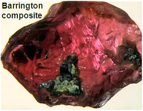 At Barrington Tops, ruby occurs as fragmented and corroded composites within alluvial deposits [40], which were derived from repeated basaltic events from the long-lived Barrington Tops volcano, which had erupted for over 55 Ma [41]. The ruby-sapphirine-spinel composites suggest a metamorphic origin at 780–940 °C [42,43]. The ruby distribution within the placers overlies three separate distinctive granitoid intrusions emplaced within the underlying fold belt sequence and age-dated by zircon SHRIMP U-Pb methods at 268, 273 and 277 Ma [44]. The granitoids include mafic granodiorites formed by interactions of mantle-derived melts with crustal rocks [45]. Southwest-facing faulted slivers of relict ophiolites to the northwest include tectonized harzbugites and intrusive mafic rocks [46]. This diverse basement provides complex metamorphic, metasomatic and contact metamorphic sources for potential ruby genesis. The Macquarie River ruby grades into pink sapphire and its source region is poorly constrained, as stones were recovered as accessories in gold dredging operations in the alluvial river bed. It accompanies diamonds and represents a distinctive highly Mg-rich, high temperature genetic type [47]. The New England ruby is a rare accessory in gem field workings within the dissected Maybole shield volcano sequences [48]. It has most unusual color zoning from ruby cores into sapphire rims and consistently high Ga content and Ga/Mg ratio compared to world-wide ruby. Rubies of diverse character other than those detailed in this study are found at Yarrowitch and Tumbarumba, NSW and ENE of Melbourne and are described in references [4,9].