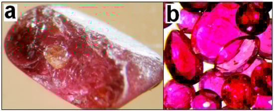 Photos of ruby features from Macquarie-Cudgegong River system alluvial deposits, NSW (a) ruby fragment, a few mm across with pyrope garnet inclusion (center). (b) Facetted stones of ruby and pink sapphire, up to 3 mm across [47]. Photographer G. Webb, Australian Museum.