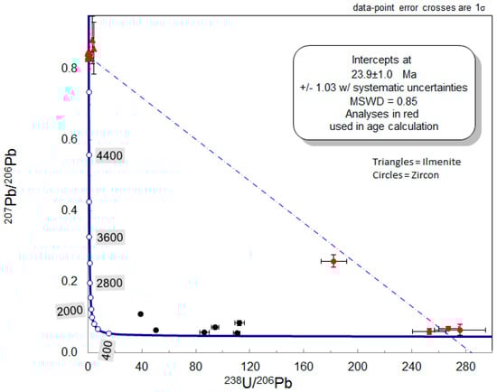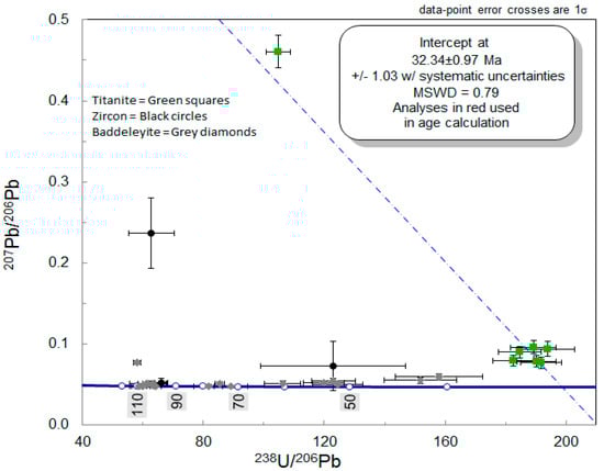 All zircon and titanite analyses were done in-situ, as small grains present as inclusions within corundum megacryst hosts. Baddeleyite was analyzed as large euhedral megacrysts. All age results and all secondary reference material analyses are presented in Supplementary Materials. Zircon and ilmenite inclusions were targeted for U-Pb analysis in the Mong Hsu rubies. These inclusions were generally >30 µm in size and euhedral in shape. Ilmenite analyses contained modest U contents (<70 ppm), however, they contained significant common Pb and so were useful as a common Pb anchor point for the zircon analyses. The zircons have significantly high U, up to 3000 ppm, and high U/Th ratios (up to 40). Analyses show significant variation in common Pb corrected age (207Pb correction), often with variable Pb/U ages within single analyses. A Concordia intercept age of 23.9 Ma (± 1.0/1.03 Ma, including systematic uncertainties respectively), calculated on the four youngest zircons formed a coherent population (MSWD 1.10, probability of fit 0.35) with ilmenite analyses included for use as a common Pb anchor (Figure 11).