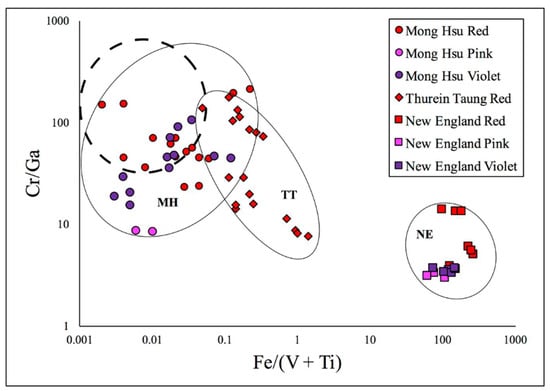 Ruby plots of Mong Hsu (MH), Thurein Taung (TT), Myanmar, and New England, East Australia (NE) are shown within oval enclosing field boundaries in a Cr/Ga vs. Fe/(V + Ti) diagram. The plots are color- and locality- coded to indicate multi-zoned crystals (top right legend). The Mong Hsu ruby field designated by Mittermayr et al. [66] is indicated by a dashed circle.