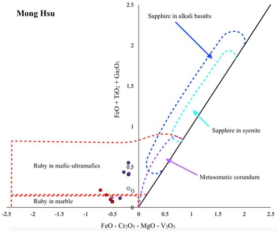 Mong Hsu ruby crystal growth and trace element analysis was used to establish a geochemical identity [66]. The study recorded dark cores, which were elevated in Cr, V, Mg, Ta, W and Th values. This trend also was noted here, in a core significantly enriched (ppm) in Cr 10,036, Ti 1272, V 909, and Mg 1272, although Ta, W and Th remained low. The earlier study suggested a distinctive geochemical field for Mong Hsu ruby, compared with other ruby fields, when Cr/Ga was plotted against Fe/(V + Ti). Strangely, however, the compared fields did not include Mogok ruby. To further test the claim, ruby analyses from Mong Hsu, Thurein Taung, Mogok, from this study and data from New England, East Australia [48] are compared with the proposed Mong Hsu field in Figure 15.