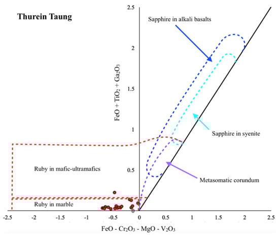 Further relationships between Myanmar and East Australian ruby suites are explored based on element oxide indices that classify corundum into genetic fields related to host rock type associations [3]. Comparative results are shown in Figure 16, Figure 17 and Figure 18. In Mong Hsu rubies red zones mostly plot in the ruby-in marble field, dark violet-blue zones mostly fall in the mafic-ultramafics field and pink to white zones lie near the boundary region. These plots correspond to the R, V and I zones described by Peretti et al. [37], considered to mark repeated influx of fluids rich in F. The F interaction decreased the Ti chromophore activity through a complexing process and effectively raised Cr chromophore ratios to color red zones. The new Mong Hsu plots support multiple interplay between separate source components, involving marble host lithologies and invading fluids from deeper seated magmatic/metamorphic sources to generate multiple color zoned corundum. The Thurein Taung plots, in contrast, nearly all closely group in the ruby-in marble field, which suggests a simpler origin.