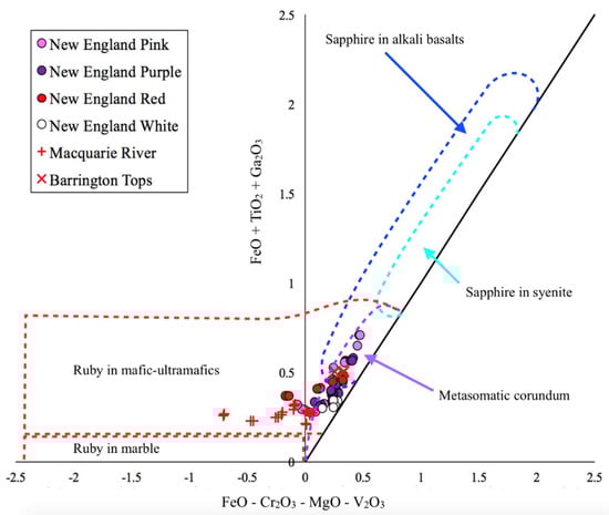 Discrimination diagram of metal oxide plots, within petrological fields after [3], for East Australian plots from Barrington Tops, Macquarie River and New England rubies. Plots are color coded to show the range of color and zoning. Symbols for different localities are shown in the legend.