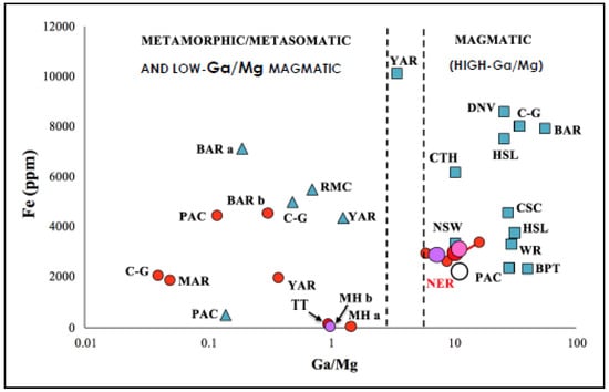 Fe-Ga/Mg diagram after [55], showing averaged plots from selected examples of ruby and sapphire suites from East Asian, East Australian and other localities, from data after [9,11,59,72]. Short dash lines mark a transitional zone (Ga/Mg 3–6) for Metamorphic/Magmatic fields [66]. Symbols include: Red-filled circles, ruby; Red-violet-white filled circles, zoned ruby-sapphire suites; Blue-filled triangles, low-Ga meta-sapphire suites; Blue-filled squares, higher-Ga sapphire suites. East Asian locality identity letters include: BT, Bo Phloi, Thailand, sapphire; CTH, Chanthanburi, Thailand sapphire; CSC, Changle, Shadong, China, sapphire; DNV, Dak Nong, Vietnam sapphire; MH, Mong Hsu, Myanmar; zoned ruby-sapphire suite; PAC, Pailin (west), Cambodia, ruby and sapphire suites; TT, Thurein Taung, Myanmar, ruby suite. East Australian locality identity letters are: BAR, Barrington Tops, magmatic sapphire, (a) meta-sapphire (b) ruby; C-G, Cudgegong-Gulgong, ruby, sapphire; MAR, Macquarie River, ruby, meta-sapphire, high-Ga sapphire; NSW, New South Wales, high-Ga sapphire; NER, New England, zoned ruby-sapphire; YAR, Yarrowitch, ruby, meta-sapphire, transitional sapphire, WR, Weld River, Tasmania, high Ga-sapphire. Other: RMC, River Mayo, Colombia, South America sapphire.