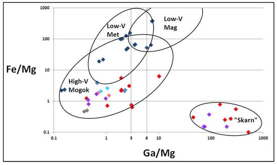 A trace element variation diagram, introduced as a tool to separate blue-colored sapphires of metamorphic, transitional and magmatic origin, by Peucat et al. [67], plotted Fe (ppm) content against Ga/Mg ratio. This tool received wider use being extended to sapphire of other colors and even ruby, as it is normally a metamorphic/metasomatic corundum and seemed to conform to the classification boundaries. [9,68,69]. Recent studies show that individual corundum crystals can show significant ranges in their Ga/Mg ratio [70], and that rare rubies from Myanmar and East Australia show high Ga/Mg ratios that lie in the magmatic field [13,48]. Furthermore, some sapphire/ruby suites with low Ga/Mg, previously thought metamorphic can contain melt inclusions suggesting a magmatic origin [71]. This makes the Ga/Mg ratios considered in isolation unreliable genetic indicators. Plots of Fe (or Fe/Mg) against Ga/Mg, nevertheless, remain useful in aiding distinctions between fields from different localities (Figure 19).