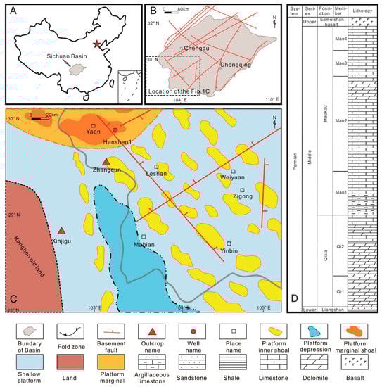 (A) Simplified location map of the Sichuan Basin. (B) Basement faults in the Sichuan Basin. (C) The location of study outcrops, wells, and sedimentary map of the Middle Permian (according to Zhou [29]). (D) Stratigraphic column of the Middle Permian in the southwest (SW) Sichuan Basin.