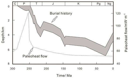 The synthetic map of burial history–paleoheat flow distribution of Well Hanshen1 in the southwest Sichuan Basin [31,32,33].