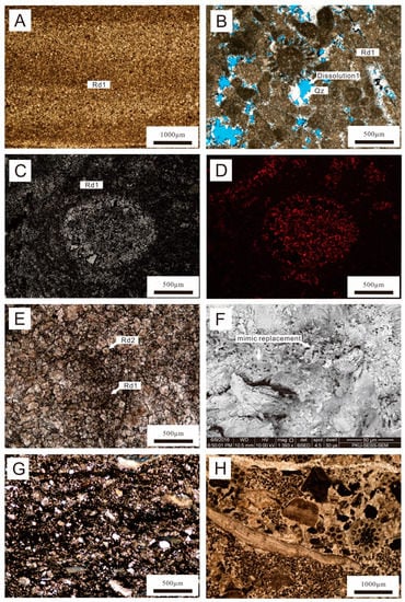 The Rd1 dolomite was mainly developed at the bottom of the Qi1 member and the upper Mao2 member in distal areas (~20% by abundance) and commonly consisted of dolomicrite to tightly packed micritic crystals (< 50 μm) displaying planar-s to nonplanar-a texture with laminar fabric (Figure 4A). The sedimentary fabrics of precursor limestones (Figure 4G,H) (mimic replacement) were preserved in Rd1 dolomite, and early-phase dissolution vugs were developed between the particles and were filled with quartz cements (Figure 4B,E,F). In the cathodoluminescence images, Rd1 displayed dull luminescence, but locally (bioclasts and part of their rims) showed relatively bright-red luminescence (Figure 4C,D).