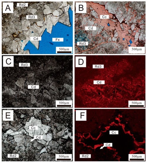 Cd dolomite. (A) Photomicrograph showing Cd dolomite filling in the hydraulic fractures (Fx), close to the matrix Rd3 dolomite and fine crystal dolomite (Rd2); (B) photomicrograph of void-filling Cd dolomite coarse-textured crystal aggregates and the residual porosity filled by later calcite (Cc) (Frac./Vug Cal) (Zhangcun; P2q); (C,D) paired photomicrographs (CL) of void-filling Cd dolomite and host Rd3 dolomite. Both Rd3 dolomite and Cd dolomite show strong dull-red luminescence and Cd dolomite exhibits mottled luminescence (Zhangcun; P2q); (E,F) paired photomicrographs (CL) of void-filling Cd dolomite, void-filling calcites, and host Rd2 dolomite. Rd2 dolomite shows dull-red luminescence and Cd dolomite shows bright-red rims with non-luminescence of calcites (Xinjigu; P2q).