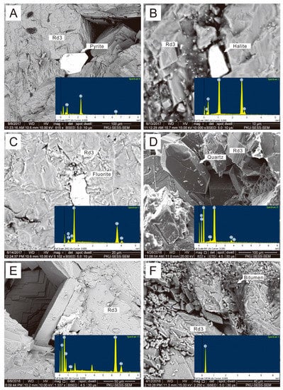 Pyrite was the most common sulfide mineral to precipitate after Rd3 and Cd dolomite (Figure 8A). SEM energy-dispersive X-ray spectroscopy (EDS) analyses also demonstrated the existence of halite, fluorite, quartz, siderite, and bitumen in the interstitial spaces between dolomite; these minerals represented the last diagenetic phases in the paragenetic sequence (Figure 8B–F).