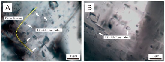 Photomicrographs showing fluid inclusion petrography. (A) Liquid-dominated fluid inclusions outlined the growth zone of Cd dolomite (Xinjigu; P2q); (B) liquid-dominated fluid inclusions in random populations were distributed evenly in a crystal without special orientation (4989.6 m; Well Hanshen1; P2q).