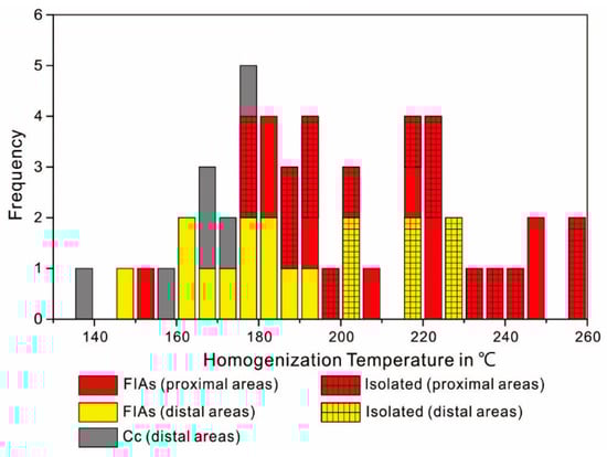 Histograms of homogenization temperatures of fluid inclusion assemblages (FIA) and isolated fluid inclusions.