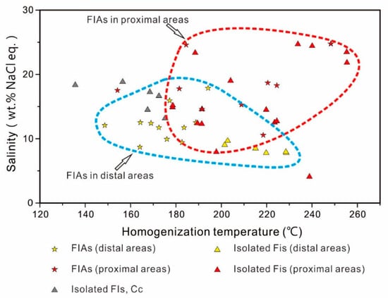 In Cd dolomite, fluid inclusions were also examined in samples both from proximal and distal areas. In samples from proximal areas, fluid inclusion homogenization temperatures ranged from 154 °C to 248 °C for FIAs and 179 °C to 255 °C for isolated fluid inclusions. Ice melting temperatures ranged from −25.3 °C to −6.9 °C for FIAs and −25.1 °C to −2.4 °C for isolated fluid inclusions, and salinities ranged from 10.5 wt.% to 24.8 wt.% for FIAs and 7.9 wt.% to 24.7 wt.% for isolated fluid inclusions. In samples from distal areas, fluid inclusion homogenization temperatures ranged from 164 °C to 194 °C for FIAs and 215 °C to 229 °C for isolated fluid inclusions, and ice melting temperature ranged from −14.2 °C to −5.5 °C for FIAs and −5.3 °C to −4.8 °C for isolated fluid inclusions. Salinities ranged from 8.7 wt.% to 17.9 wt.% for FIAs and 7.8 wt.% to 8.5 wt.% for isolated fluid inclusions.