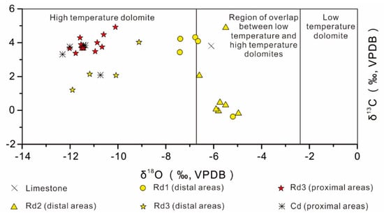 Most bioclastic limestone and Rd1 and Rd2 dolomite samples for carbon and oxygen isotope analysis were collected from distal areas, and Rd3 samples were collected from both proximal and distal areas, whereas Cd samples were only collected from proximal areas. The δ18OVPDB value of bioclastic limestone was −6.1‰ and the δ13CVPDB value was 3.8‰. Rd1 dolomite had δ18OVPDB values between −7.4‰ and −5.2‰, and δ13CVPDB values between −0.4‰ and 4.3‰ (Table 2; Figure 12). Rd2 dolomite yielded δ18OVPDB values from −6.6‰ to −5.5‰ and δ13CVPDB values from −0.0 ‰ to 4.9‰. Rd3 dolomite samples were collected from both distal and proximal areas. For Rd3 dolomite samples from distal areas, the δ18OVPDB and δ13CVPDB values spanned from −12.0‰ to −9.1‰ and from 1.2‰ to 4.0‰, respectively, whereas, for Rd3 dolomite from proximal areas, the δ18OVPDB and δ13CVPDB values spanned from −12.0‰ to −10.1‰ and from 3.4‰ to 4.9‰, respectively (Table 2; Figure 12).