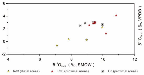 The δ18OVSMOW and δ13CVPDB values of the parent fluids of Rd3 and Cd dolomite (δ13Cfluid and δ18Ofluid) were calculated from the δ18O and δ13C values of the carbonate minerals, and the average temperatures were based on homogenization temperatures of the FIAs (Table 2; Figure 13). The δ13Cfluid-VPDB and δ18Ofluid-VSMOW values of Rd3 dolomite from distal areas ranged from −0.59‰ to 2.23‰ and 7.1‰ to 9.97‰ respectively, and the δ13Cfluid-VPDB and δ18Ofluid-VSMOW values of Rd3 and Cd dolomite from proximal areas ranged from 1.29‰ to 4.12‰ and 8.88‰ to 10.85‰, respectively (Table 2; Figure 13).