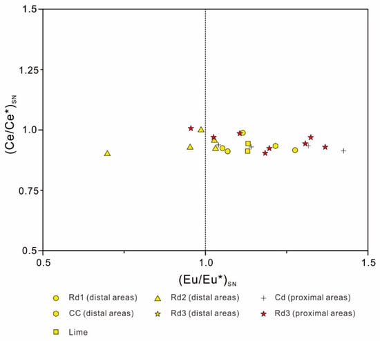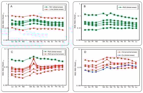 The REE data were normalized to the post-Archean Australian shale (PAAS) [35] (Table 3). The limestone and Rd1 dolomite were characterized by flat REE patterns, slight light REE (LREE) enrichment (average NdSN/YbSN = 1.11, n = 6), and slight positive Eu anomalies (Table 3, Figure 15A, Figure 16 and Figure 17). Rd2 dolomite showed similar REE patterns to limestone Rd1, with slight LREE enrichment (average NdSN/YbSN = 1.12, n = 5), slight negative Ce anomalies, and variable Eu anomalies (Table 3, Figure 15B, Figure 16 and Figure 17). Rd3 dolomite from both proximal and distal areas was characterized by prominent positive Eu anomalies (average Eu/Eu* = 1.53, n = 11) and heavy rare earth elements (HREE) enrichment (average NdSN/YbSN = 0.72, n = 11) (Table 3, Figure 15C, Figure 16 and Figure 17). The Cd dolomite samples had similar REE patterns to Rd3 dolomite, including significant positive Eu anomalies (average Eu/Eu* = 1.23, n = 4) and HREE enrichment (average NdSN/YbSN = 0.81, n = 4) (Table 3, Figure 15D, Figure 16 and Figure 17).