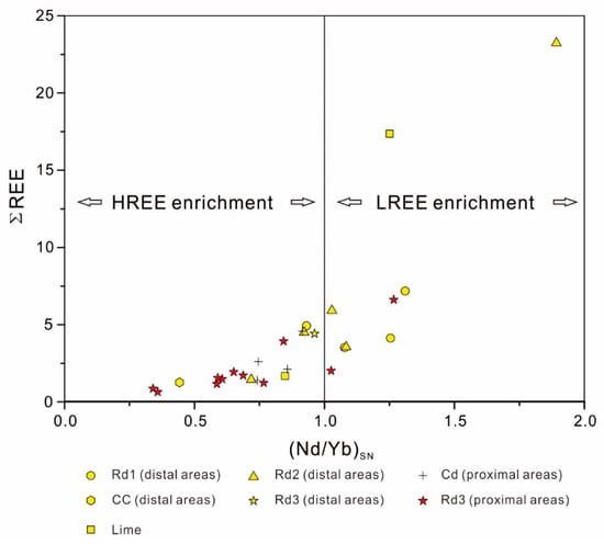 Cross-plot of total REE and NdSN/YbSN of limestone and dolomite shows light REE (LREE) or heavy REE (HREE) enrichment [48]. Field of LREE enrichment: NdSN/YbSN > 1; field of HREE enrichment: NdSN/YbSN < 1.