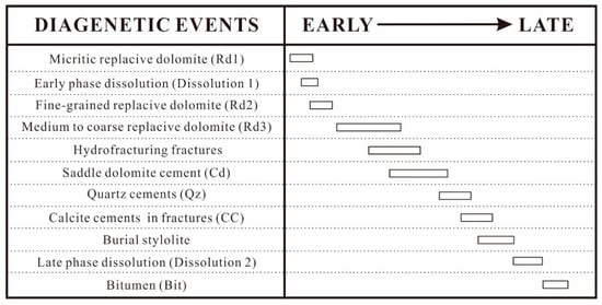 The paragenetic sequence (Figure 18) was established based on the cross-cutting relationships observed in the field, hand samples, and thin sections, as illustrated in Figure 9. Rd1 dolomite was interpreted to have formed in penecontemporaneous period, whereas Rd2 dolomite formed in a shallow burial depth, as Rd2 appeared to recrystallize from Rd1 (Figure 4E). Rd2 was further crystallized to Rd3, which was transitional to Cd (Figure 7A). Cd dolomite occurred as cement lining the wall of the hydrofractures, suggesting that Cd postdated hydraulic which may have been caused by elevated pore fluid pressure. Quartz occurred as cement in the intercrystalline pores of Rd3 dolomite (Figure 6B), and may have been formed at the same time or slightly later than Cd. Calcite cements in microfractures cross-cut the quartz cement and Rd3 dolomite, and were in turn cross-cut by stylolites and associated bitumen (Figure 7C), which represent the latest diagenetic event recorded (Figure 18).