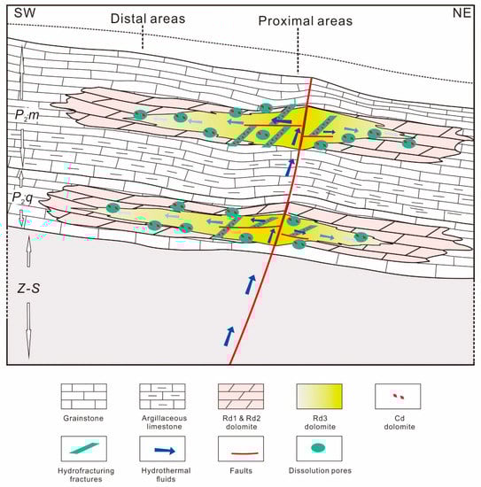The hydrothermal dolomitizing fluids may have been derived from the deeper part of the basin, and were channeled along basement-rooted faults to the Middle Permian strata, where the carbonates were dolomitized (Rd1 and Rd2). Deep-seated processes in association with the ELIP may have resulted in frequent faulting and hydrofracturing, favoring the reworking of preexisting dolomite and precipitation of dolomite cements in fractures and void space. In areas proximal to the faults, Rd1 and Rd2 were extensively modified to Rd3, and Cd was intensively developed, creating zebra fabrics in the rocks. The hydrothermal dolomitizing fluids may have continued to migrate laterally along the strata due to increased porosity and permeability associated with the Rd1 and Rd2 dolomitization. With increasing distance from the feeder faults, the temperature of the dolomitizing fluids decreased, and less and less Rd1 and Rd2 were recrystallized to Rd3. As a result, in distal areas far away from the faults, only a small amount of Rd3 and a minor amount of Cd were developed. The decrease in fluid temperature from the proximal to distal areas was well recorded by fluid inclusion homogenization temperatures (Figure 11 and Figure 12). The cause of the decrease of salinities might be the incorporation of other fluids of relatively low salinities. The salinity of Permian seawater was 2.3% [77]; thus, the decreased fluid salinities in the distal areas (Figure 11) may be the result of mixing of the hydrothermal fluids with residual seawater in the strata.