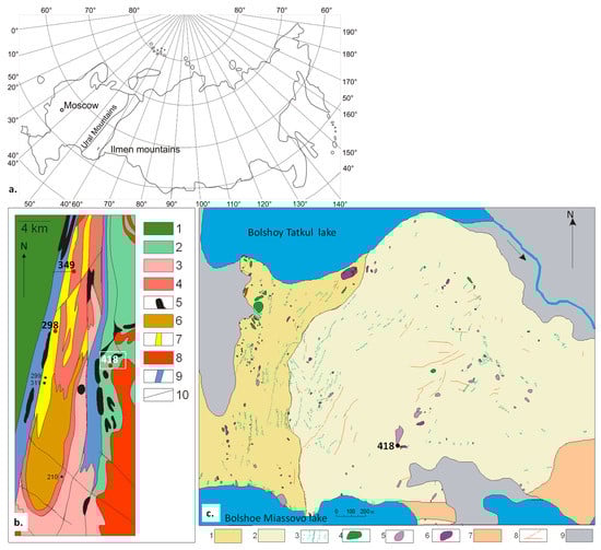 Location and geology of Ilmen sapphire deposits in meta-ultramafic host rocks: (a) General map of Russia showing location of Ilmen Mountains within Urals; (b) Regional geologic map of Ilmenogorsky complex after [4] with location of corundum mines within syenite pegmatites (mines 298 and 349) and within meta-ultramafic host rocks (mine 418): 1—sedimentary-volcanogenic metamorphosed rocks of the East Urals mega-zone (Upper Devonian-Lower Carboniferous), 2—volcanogenic-sedimentary metamorphosed strata of the Saitovsky series, 3—metamorphic rocks of the Ilmensky series, 4—metamorphic rocks of the Selyankinsky series, 5—meta-ultramafic rocks, 6—syenites and nepheline syenites, 7—fenites, 8—granitoids, 9—zones of blastomylonites, 10—faults, shear zones and other tectonic contacts. White box with 418 mine is shown in details in Figure 1b; (c) Regional geologic map after [8] with 418 mine of sapphire-spinel-chlorite-muscovite metasomatites within meta-ultramafic host rocks at 55.178434° N, 60.292494° E: 1—Lower-Kyshtymsky stratum, generally gneiss; 2—Upper-Kyshtymsky stratum, mostly quartzite; 3—traced horizons of various rocks (biotite and amphibole gneisses, diopside-scapolitic and kyanite schists, quartzites); 4—clastoliths and bodies of amphibolites; 5—tremolite-anthophyllite meta-ultramafites; 6—enstatite (±olivine) -antophyllite meta-ultramafites; 7—granite aplite; 8—granite pegmatites and granite dikes; 9—wetlands.