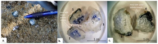 Sapphire occurrence is a plate-shaped symmetrical-zonal body with traces of considerable deformation, with a dip azimuth of 330°; dip angle is 40°; and, its thickness varies from 1.0 to 1.3 m (Figure 3a). The mine 418 with sapphire-spinel-chlorite-muscovite rock was opened from the surface by a trench measuring about 4 × 9 m (Figure 3b). The block of meta-ultramafites hosting corundum-spinel-chlorite-muscovite rock occupied the first tens of meters and up to about 35 m along the drainage ditch (Figure 3a). The meta-ultramafic host rocks consist of purely mono-mineral coarse-grained enstatite up to 4–5 cm in length with minor olivine and clinopyroxene; in some areas, they are replaced by talc and chrysotile-asbestos. Besides, there is a completely replaced pyrite by goethite in the rock. In the surface subsoil layer, there are chalcedony-quartz concretions up to 10 cm in length, while limonite and supergenic carbonate developed along the cracks of host rocks.
