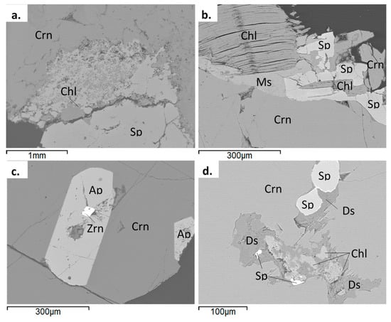 Backscattered (BSE) images of corundum-spinel-chlorite samples from the central zone: (a) Corundum-spinel intergrowth with inclusions of clinochlore; (b) The rim of corundum-spinel concentric aggregate with intergrowth of clinochlore and muscovite; (c) Inclusions of apatite and zircon within corundum; and, (d) Inclusions of spinel, clinochlore, and diaspore (Ds) within corundum. Mineral abbreviations are after [12]. BSE images by E.S. Sorokina.