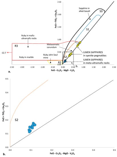 (a) A plot of Ilmen sapphires within meta-ultramafic rocks (bold blue circles) in a FeO–Cr2O3–MgO–V2O3 versus FeO–TiO2–Ga2O3 diagram (in wt. %) used for the geological classification of corundum deposits are modified after [18]. The main fields defined for the different types of gem corundum deposit are: John Saul Ruby Mine (Kenya) type (R2) is for ruby; for sapphire, syenitic rocks (S1); metasomatites (S2); xenocrysts in alkali basalt and lamprophyre (S3). The domains of ruby in mafic–ultramafic rocks and S2 are overlapping. Values of Ilmen sapphires within syenite pegmatites are after [6]. (b) Focus on the distribution of Ilmen sapphires within metasomatites (S2) of the plot A).
