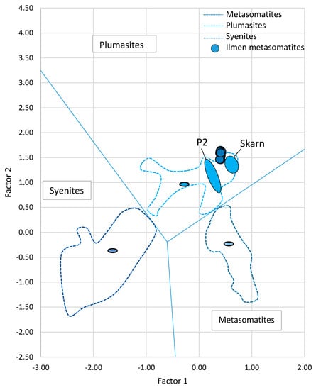 A plot of Ilmen sapphires within meta-ultramafic rocks (bold blue circles) in discriminant factors diagram is modified after [18]. Colored ovals are averages of syenites, plumasites, and metasomatites. P2 is an extension of metasomatic type according to [18].