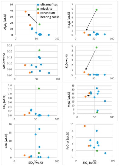 Variations of selected elements in whole-rock compositions from Table S13. Black arrows show the source of major elements of metasomatites. Chemistry of miascite is after [25].