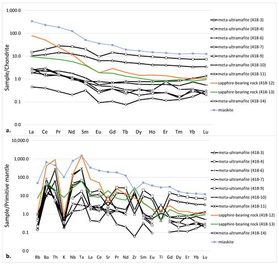 ICP-MS measurements are shown in Table S13. The distribution of REE in micaceous lenses has the general trend—an enrichment with LREE as compared to HREE (Figure 11a). This phenomenon is possibly due to the inclusions of LREE-bearing minerals, e.g., monazite-(Ce), allanite-(Ce) or others. In the meta-ultramafic host rocks, this trend is less pronounced or it disappears: REE contents normalized to chondrite are almost the same for both LREE and HREE. Nearly all of the studied rocks show negative Eu anomalies. The REE trend of these corundum-bearing rocks is close to that observed for Ilmen corundum-bearing syenite pegmatites (Sorokina et al., unpublished data) and to that of corundum syenite pegmatites hosted by ultramafic rocks in the French Pyrénées [23]. Enrichment in HSFE was also noted (mine 418); commonly observed for alkaline-ultramafic associations of the platform type (ultramafic rocks, syenites–carbonatites etc.; [24]), and similar to those of miaskite (nepheline syenite) of the Ilmenogorsky complex. On a trace element diagram normalized to primitive mantle (Figure 11b), all studied rocks present distinct K and Ti negative anomalies. However, the sapphire-bearing rocks also show positive Ta and Gd anomalies, but with different Sr anomalies.