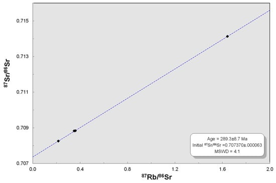 Rb-Sr and Sm-Nd isotope measurements of sapphire-bearing rocks 418-12 and 418-13 previously analyzed by EDXRF and ICP-MS are presented in Table S14. As well, two samples of 418-13 rock containing feldspar and two samples of mica extracted from appropriated rock sample 418-13 associated with sapphire mineralization were analyzed in order to constrain the Rb-Sr age. Obtained values of Rb, Sr, Sm, and Nd by TIMS are closely similar or comparable to those that were received by ICP-MS (Tables S12 and S13). 87Sr/86Sr for samples 418-12 and 418-13 are varied from 0.708764 ± 0.000010 (2σ) to 0.710587 ± 0.000006 (2σ). For mica samples, these values are higher and vary from 0.711371 ± 0.000008 to 0.714131 ± 0.000016. The calculated Rb-Sr isochrone age for three rock samples and mica-2 sample is 289.3 ± 8.7 Ma (2σ), MSWD is 4.1 (Figure 12). Note, the calculated Rb-Sr age for another mica sample (mica-1) with three rock samples gave much higher error (352 ± 35 Ma) and higher MSWD (72), which was likely due to the secondary alteration of muscovite samples mica-1. (87Sr/86Sr)289 of all samples recalculated on 289 Ma are about 0.707351 to 0.707919. 143Nd/144Nd for the samples 418-12 and 418-13 are 0.5122 ± 0.000008 (2σ) and 0.5122 ± 0.000012 (2σ), εNd(289 Ma) is −7.8. The obtained high 87Sr/86Sr ratios and low εNd correspond to the formation of the newly discovered corundum-bearing rocks under the significant influence of crustal fluids.