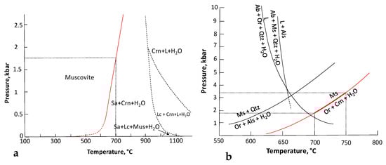 (a) The equilibrium curve (solid and dash) for the reaction Sa (sanidine) + Crn + H2O ⇆ Mus, estimates of the equilibrium curve for the melting of sanidine and leucite—Lc (dash) in the muscovite composition, and possible relations between the assemblages Sa + Crn + H2O and Mu + Sa + Lc + H2O are modified after [34]. (b) Phase relations in peraluminous granitic systems in terms of pressure and temperature after [35]. The dashed line is a metastable extension of the reaction Ab (albite) + Ms (muscovite) + Qtz (quartz) + H2O = melt + aluminum silicate to 2 kbar pressure. The H2O-saturated haplogranite solidus (Ab + Or (orthoclase) + Qtz + H2O = melt) and the subsolidus second sillimanite isograd (Ms + Qtz = Or + aluminum silicate + H2O) were determined by [36] and [37]. The terminal muscovite reaction Ms = Or + Crn + H2O comes from [35]. The diagram was modified after [33].