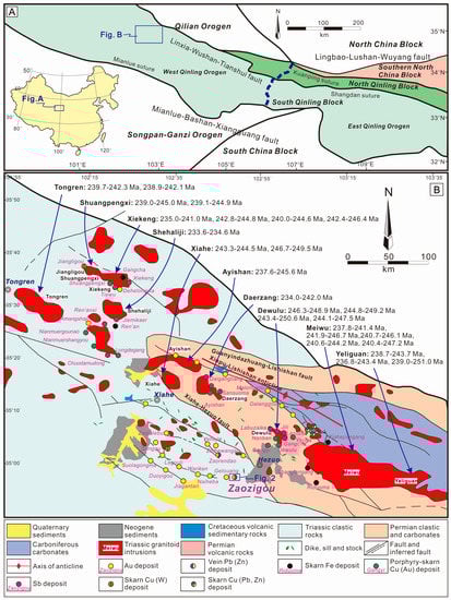 (A) Major tectonic domains of China and the location of the Qinling Orogenic Belt. Inset shows the location of the study area (modified after [6]). (B) Simplified geological map of the Tongren–Xiahe–Hezuo area of the Western Qinling Orogen, showing distributions and ages of early Triassic granitoids and ore deposits (modified after [6]).