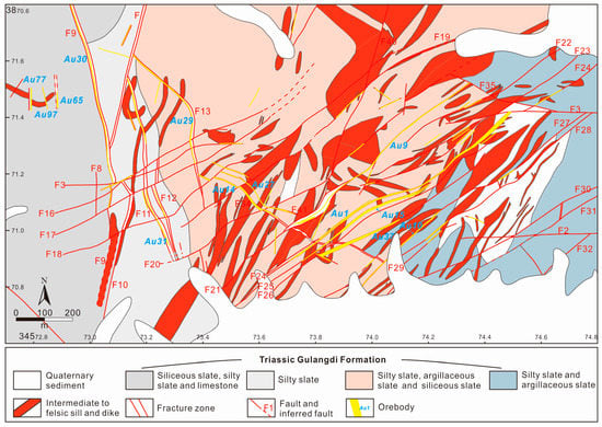 The Triassic Gulangdi Formation is the main host for the deposit (Figure 2). These rocks, which account for 70% of the outcrop area, are mainly composed of siliceous slate, calcareous slate, quartz sandstone, and siltstone [8,16,17,18,19]. Numerous NE- and NNE-trending intermediate to felsic sills and dikes intrude the regional greenschist facies meta-sedimentary rocks. These sills and dikes also host Au-Sb ore, and consist of porphyritic dacite, granodiorite, and porphyritic rhyolite. Previous age estimates suggest these igneous rocks vary from 250 to 215 Ma [8,16]. Four deformation events have been recognized. D1: NE-trending compression that produced NW-trending folds and thrusts, induced NS-, NE-, and nearly EW-trending fractures, and controlled emplacement of NE-trending dikes. D2: NE-, NNE-, NS-trending brittle faults. D3: Low-angle nearly EW-trending faults. D4: NNE-trending left-lateral transtensional faults that locally cut orebodies. The D2 and D3 stages are the main deformational events associated with the ores [8,16,17,18,19].