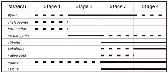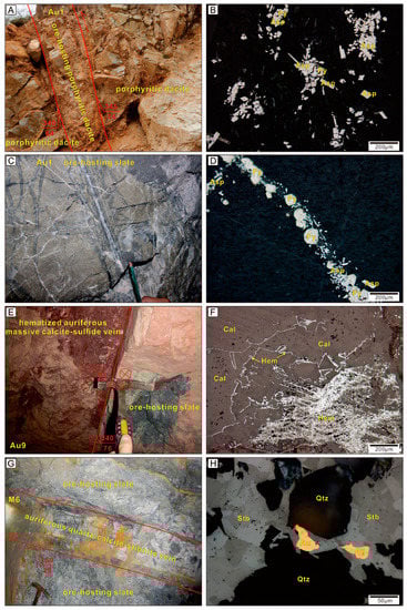 The ore-bearing zones comprise disseminated and veinlet ores within altered dikes (Figure 3A,B) and slates (Figure 3C,D), and gold- and/or stibnite-rich quartz±calcite load vein mineralization (Figure 3E–H). They are structurally controlled by the NE-, NS-, and NW-trending faults, and are characterized by strong sulfidation (pyrite, arsenopyrite, stibnite), sericitization, silicification, and carbonatization in the wallrocks. Some of the gold- and stibnite-rich quartz±calcite veins are also structurally controlled by low-angle E–W faults. The iron-rich minerals or wallrock are important chemical traps for ore mineralization through wall rock sulfidation reactions (Figure 3A–D). The ore minerals in addition to the abundant stibnite, include lesser amounts of pyrite, arsenopyrite, sphalerite, chalcopyrite, tetrahedrite, galena, and native gold. The gangue minerals consist of quartz, biotite, calcite, sericite, feldspar, and epidote, with minor apatite, titanite, zircon, and monazite. Native gold grains occur in cracks or as inclusions within stibnite and quartz. Invisible gold is present in pyrite and arsenopyrite. Four paragenetic stages are identified based on crosscutting relationships and mineralogical and textural characteristics: stage 1 pyrite-chalcopyrite-tetrahedrite-quartz, stage 2 pyrite-arsenopyrite-quartz, stage 3 stibnite-sphalerite-quartz-native gold, and stage 4 stibnite-quartz-calcite (Figure 4).