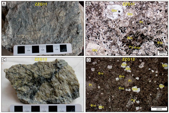The detailed investigations of the present study focus on the porphyritic dacite dikes in the Zaozigou deposit. Representative samples were collected from the wallrock of the #Au1 orebody. The porphyritic dacite samples (ZZG11 and ZZG12) are light green to buff in color texture (Figure 5A,C). The phenocrysts include quartz (15–20 vol %, long dimension 0.1–1.5 mm), plagioclase (5–15 vol %, long dimension 0.1–2.5 mm), and biotite (5–15 vol %, long dimension 0.1–2 mm). Some quartz grains show rounded or angular-crystal habit, with dissolution textures. The plagioclase and biotite grains are variably altered to fine sericite and chlorite. The groundmass consists of plagioclase, quartz, and minor K-feldspar. Accessory minerals are mainly zircon, apatite, epidote, chlorite, and sericite (Figure 5B,D). Ore mineralogy consists mainly of pyrite and arsenopyrite, which are commonly sitting in iron-rich minerals, notably biotite which has been hydrothermally altered to sericite or chlorite (Figure 5B,D).