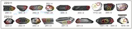 Representative cathodoluminescence images and photomicrographs of zircons derived from ZZG11 and ZZG12 with identified analytical spot, U-Pb age (Ma) and εHf(t) value. Red circle: U-Pb beam. Yellow dash circle: Hf beam.