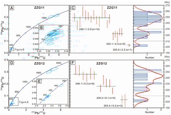 LA-ICP-MS zircon U-Pb concordia diagrams for ZZG11 (A–C) and ZZG12 (D–F).