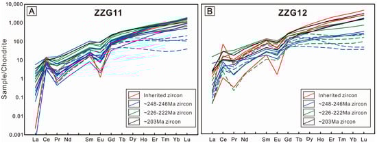 Trace element compositions of zircons from sample ZZG11 and ZZG12 are listed in Table 2. The chondrite-normalized REE patterns are illustrated in Figure 8. The inherited zircons show strong positive Ce (Ce/Ce* ratios, where ) and negative Eu (Eu/Eu* ratios, where ) anomalies, ranging from 2.48 to 394.68, and 0.02 to 0.43, respectively. The ~248–246 Ma and ~226–222 Ma zircons show moderate positive Ce and negative Eu anomalies. The Ce/Ce* and Eu/Eu* of ~248–246 Ma zircons vary from 1.31 to 61.75 and 0.18 to 0.62, respectively. The Ce/Ce* and Eu/Eu* of ~226–222 Ma zircons vary from 1.24 to 4.90, and 0.46 to 0.63, respectively. The ~203 Ma zircons have high REE contents and weak positive Ce (Ce/Ce* = 1.48 to 4.37) and negative Eu anomalies (Eu/Eu* = 0.44 to 0.73).