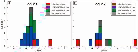 The zircon crystallization temperatures and oxygen fugacities were calculated and listed in Table 2 and Figure 9. Aberrant REE values (dashed lines in Figure 8) which may be indicative of contamination by inclusions or alteration are excluded from the calculation (Figure 6). The logarithmic oxygen fugacities (fO2) of the inherited zircons range from −10.58 to −1.39, with ΔFMQ ranging from −6.13 to 2.93. The logarithmic oxygen fugacities of the ~248–246 Ma zircons range from −9.17 to −7.16, with ΔFMQ ranging from −4.61 to −2.56. The logarithmic oxygen fugacities of the ~226–222 Ma zircons range from −8.08 to −6.09, with ΔFMQ ranging from −3.52 to −1.48. The logarithmic oxygen fugacities of the ~203 Ma zircons range from −7.99 to −6.45, with ΔFMQ ranging from −3.47 to −1.74.