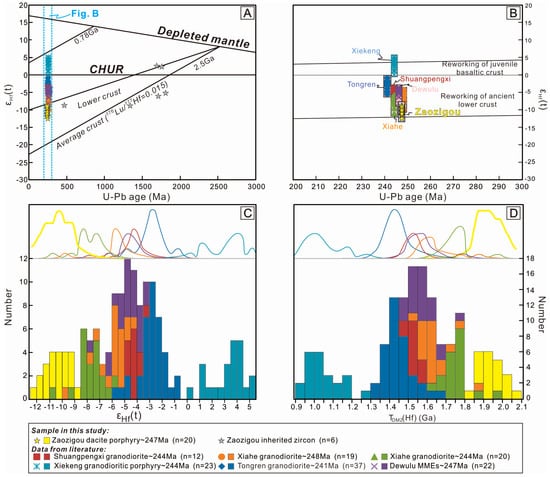 Variations of εHf(t) values versus U-Pb ages (Ma) of zircons from the Triassic granitoids in the Tongren–Xiahe–Hezuo area (A,B). (C) Histograms, and frequency curves of εHf(t) values. (D) Histograms, and frequency curves of corresponding two–stage Hf model ages (TDM2) (modified after [6]).