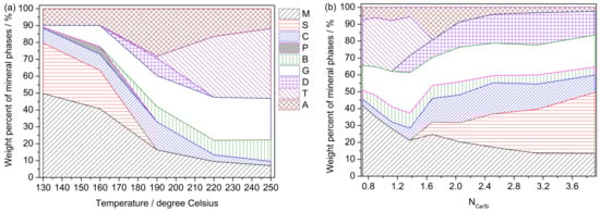 Results of quantitative phase analysis by the Rietveld method: (a) with reaction temperature; (b) with Ca/Si molar ratio (see the detail of the reactant ratio in Table S1). Abbreviations: M—K-feldspar [KAlSi3O8]; S—Calcium hydroxide [slaked lime (portlandite), Ca(OH)2]; C—Calcite [CaCO3]; P—Potassium carbonate [K2CO3]; B—Bütschliite [K2CaCO3]; G—Grossular [Ca3Al2(SiO4)1.53(OH)5.88]; D—alpha-dicalcium silicate hydrate [α-C2SH, Ca2(SiO3OH)(OH)]; T—Tobermorite [Ca2.25(Si3O7.5(OH)1.5)(H2O)]; A—Amorphous phase.