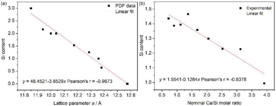 The hydrogarnet is an important mineral that is often found in nature and hydrated cement. A calcic hydrogarnet that occurs frequently in the literature is hydrogrossular, Ca3Al2(SiO4)3−x(OH)4x (0 ≤ x ≤ 3), and has intermediate compositions between grossular (x = 0) and katoite (x = 3). The structure of hydrogarnet (cubic, space group , no. 230) consists of AlO6 octahedra and SiO4 tetrahedra linked with oxygen and the hydroxyl component (OH) in a solid solution with both (OH) and (SiO4) units depending on the composition x [45,46]. A linear relationship between lattice parameter a and x or a and Si content was observed for natural and artificial hydrogarnet [32,47,48], and a good agreement of the Si content estimates from XRD and EPMA was proven [32]. By plotting Si content (3 − x) against lattice parameter a from the powder diffraction file (PDF) data, a linear equation was obtained for hydrogarnet (Figure 4a):