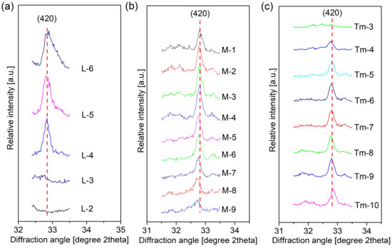 Diffraction peak from hydrogarnet (420) with various hydrothermal conditions: (a) reaction temperature; (b) Ca/Si molar ratio (NCa/Si); (c) reaction time (data of Tm–3 to Tm–10 were from the previous publication [22]).