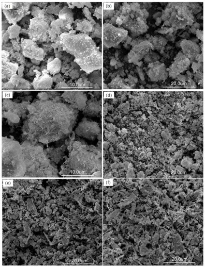 Considering the complexity of the products and the inability to identify the phases of different morphology, we do not discuss the SEM images of the samples of M–1 to M–9 and only present the SEM images of the starting materials K-feldspar and lime (Figure 6) and the samples of L–1 to L–6 (Figure 7).