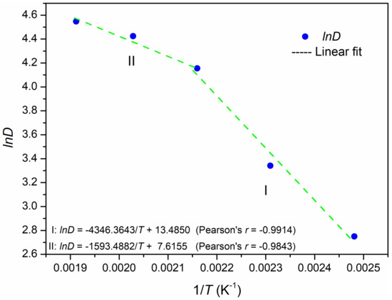Based on Equation (5), the activation energies were calculated as 36 kJ/mol at 130 °C ≤ T ≤ 190 °C and 13 kJ/mol at 190 °C ≤ T ≤ 250 °C.