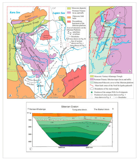 The Siberian trap province covering 1.5 million km2 [31], is the largest continental flood basalt province on Earth. Siberian traps are located in the central part of the East Siberian platform and the South Taimyr peninsula (Figure 1a); these were combined into a single craton at the end of the Proterozoic [32]. The main structures are (Figure 1a): (1) the Anabar and Aldan shields, (2) the Tunguska, Viluy, and Angara-Taseeva syneclises, and (3) the Yenisey-Khatanga, Priyeniseysky, and Noril’sk-Kharaelakh troughs [19]. The interpretation of the deep structure of the Siberian Platform [22] is based on a number of seismic profiles (that were constructed with the aid of nuclear and chemical explosions, methods of deep seismic sounding). The main seismic profiles are “Craton” and “Kimberlite”, across the West Siberian and East Siberian platforms, and the “Meteorite” profile from Taimyr to Baikal (Figure 1c). The latter shows a clear difference in the structure of the lithosphere under the Yenisey-Khatanga trough and the Angara-Taseeva syneclise in comparison with the Siberian Craton. Low velocity zones (velocity of longitudinal waves is 8.1 km/s) occur at a depth of 80–100 km under the Yenisey-Khatanga trough, and 110–160 km under the Siberian craton. Based on these data, as well as large-scale geophysical data, there is also a significant difference in the crustal structure of the north and central parts of the province is shown as well (Figure 1c). The Moho boundary rises to a depth of 31–32 km in the Norilsk region while it is located at 51 km in the center of the Tunguska syncline.