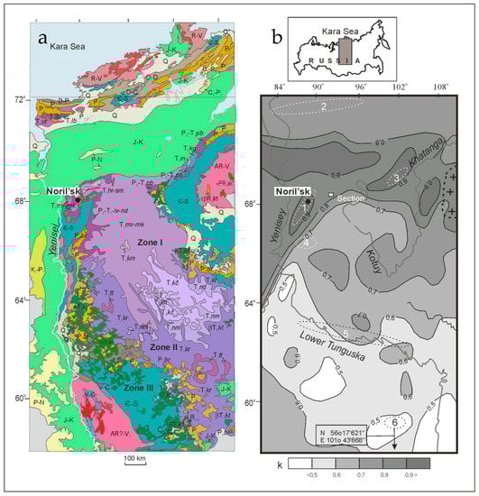 (a) Geological map of the Krasnoyarsk district modified after [36] and (b) map of the k-coefficient basement for the crust (defined as the ratio of the thickness of mafic and ultramafic rocks to the whole thickness of the crust) modified after [33]. The numbers on Figure 2b indicate the areas studied in this project: 1—Noril’sk, 2—Taimyr, 3—Maymecha-Kotuy, 4—r. Kulyumber, 5—r. Lower Tunguska, 6—r. Angara (outside of the map, with coordinates). The position of the stratigraphic section given in Figure 3 is labeled as “Section”.