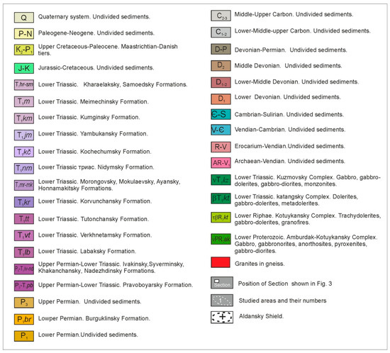 - Legends to the Geological Maps of 1:1000000 Scale, the 3-d Generation, Q-45-47, P-46-48, O-46-48. Available online: http://www.vsegei.ru/ru/info/pub_ggk1000-3/ (accessed on 17 January 2019 ).